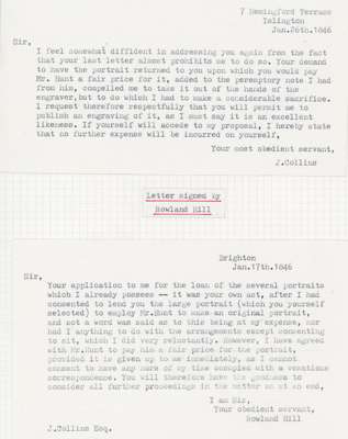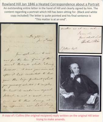 1846 (Jan 17th) letter signed by Rowland Hill addressed to J.Collins where Hill expresses his displeasure regarding the arrangements and sittings for a portrait that has been commissioned. ‘’ I cannot consent to have any more of my time occupied with a vexatious correspondence. You will therefore have the goodness to consider all further proceedings in the matter as at an end''. Lot includes a typed transcript of Hills reply and J.Collins original letter and a reproduction of the portrait in question. Fine.