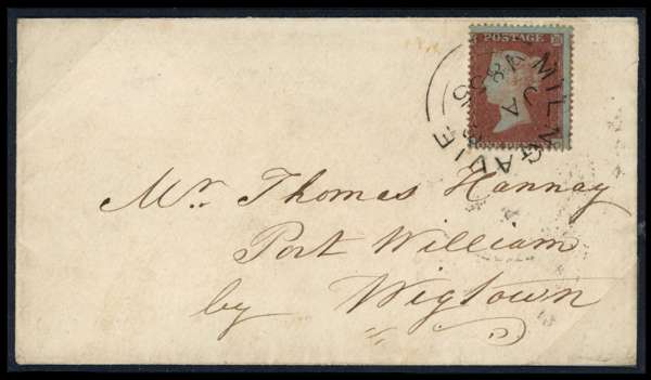 1854-57 1d red-brown, perf 16, on cover to Wigtown, tied by a superb strike of the Milngavie double arc cds for JA 3 1855 and backstamped by Glasgow cds for the same day. A rare and most attractive cover. SG 17.