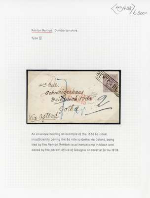 1858 (AU 18) cover to Gotha, Germany, via Ostend, franked by 1857 6d lilac, tied by a very fine strike of the type IV "Renton Renton" Scots local, and with red ‘insufficiently/stamped’ instructional mark and endorsed with a m/s ‘2’ charge mark, backstamped by six markings including ‘Aus England Per Aachen’ cds for 20 8. The adhesive with the upper perfs trimmed, still a rare use. SG 68.