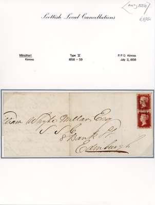 1858 (JY 2) entire bearing a vertical pair of 1854-61 1d rose-reds to Edinburgh, cancelled by a superb strike of the rare type V "Milnathort", Kinross, Scots local in black ink, and backstamped by Kinross double arc ds. The cover with extensive splitting and light perf tones to the adhesives. Rarity "G".