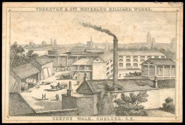 POSTAL HISTORY: c.1870 illustrated book post card advertising ‘Thurston & Co, Billiard Table Manufacturers, Strand, London', the reverse with printed images of their Cheyne Walk, Chelsea. S.E. works bearing 1870-79 ½d, plate 5 (LS), cancelled by ‘N/P/B’ hs; some inconsequential toning. A fabulous and most unusual item. SG 48/9