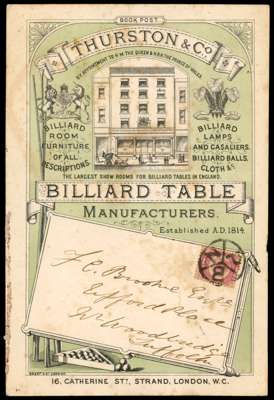 GB c.1870 illustrated book postcard advertising a Billiard Table Manufacturer