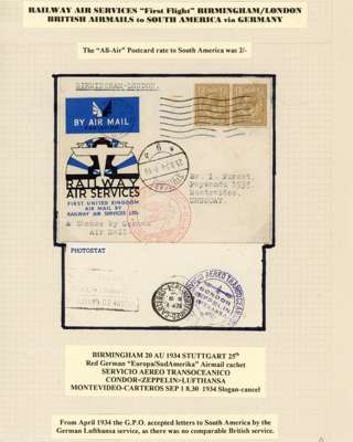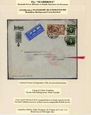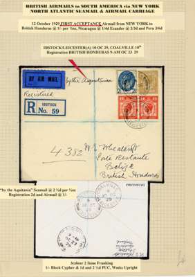 KGV postal history selection on album leaves including 1928 First Acceptance airmail cover to Peru, with ½d, 2x1½d, 9d and 1s, printed matter rate, tied Gosport cds, 1929 registered airmail cover to British Honduras with PUC 1½d x 2, 2½d and 1s tied Leicester cds with “by the Aquitania” sea mail, in manuscript, airmail cover to Argentina with 2s6d Seahorse and 2 x 9d tied by Preston cds with Lufthansa cachet in red below, 1934 Birmingham to Uruguay by Railway Air Services, postcard rate, with 2x1s tied by machine cancel with Lufthansa cachet in red and Stuttgart transit mark. Interesting group, fair to fine. (4),