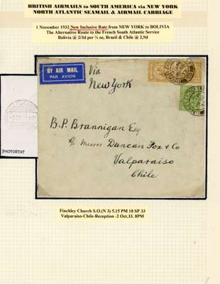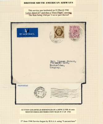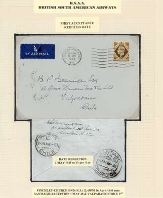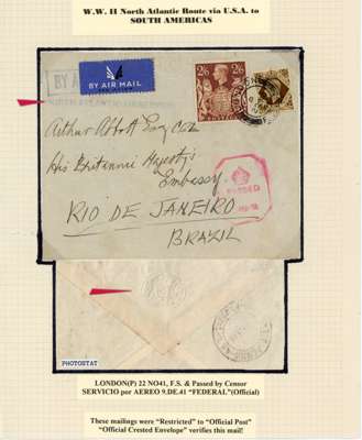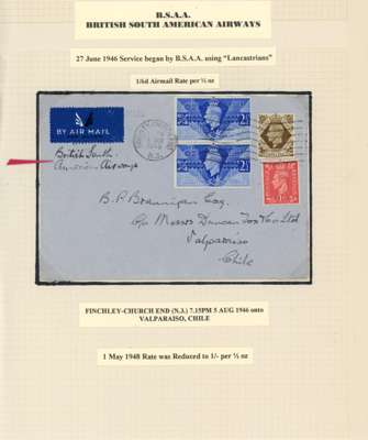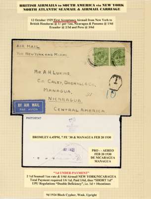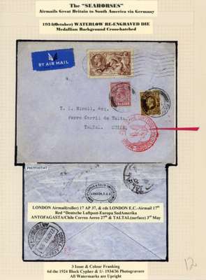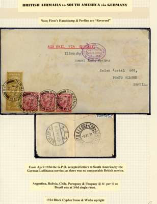 KGV postal history selection on album leaves including 1929 airmail cover to Nicaragua with 9dx2 tied Bromley cds with “½d UNDER-PAYMENT” mark on reverse, 1929 airmail cover to Chile with 2d, PUC 2½d, 9dx2 and 2s6d seahorse tied Liverpool cds, 1932 airmail cover to Chile with 9d and 1sx2 tied Finchley cds, 1934 airmail cover to Brazil with 6dx3 and 1spair tied Birmingham cds, 1934 airmail cover to Brazil with 1s and 2s6d seahorse tied London cds, 1934 airmail cover to Chile with 6d, 1s and 2s6d seahorse tied London cds with “DEUTSCHE LUFTPOST/EUROPA SUDAMERIKA” cachet in red, 1941 airmail cover to Brazil with 1s and 2s6d tied London cds and censor in red below, plus three other post war covers to Chile (2) and Uruguay (1). Interesting group, fair to fine. (10)