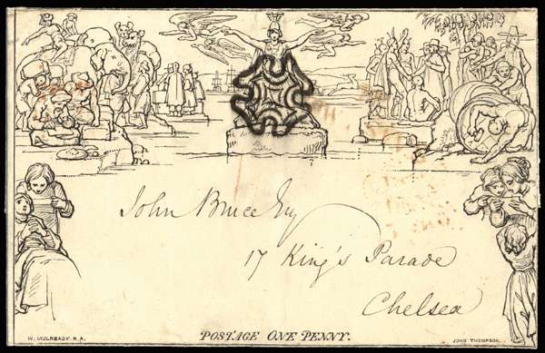 1840 1d Mulready lettersheet, Forme 1 Stereo A4. Cancelled with a fine black MC, during the experimental period trialling black ink. Sent within London and backstamped DE 22 1840. SG ME1