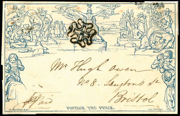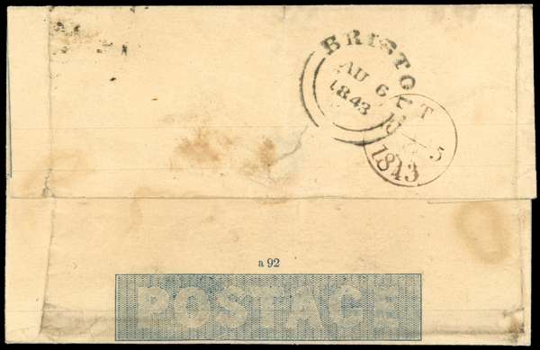 1840 2d Mulready sent from London to Bristol, cancelled by a fine strike of the London ‘10’ in Cross. The reverse with London despatch of AU 5 1843 and Bristol arrival of the following day. Filing folds, small surface scuff at top left and some minor soiling, still a great rarity, one of only four examples recorded by Rockoff and Jackson. SG ME3.