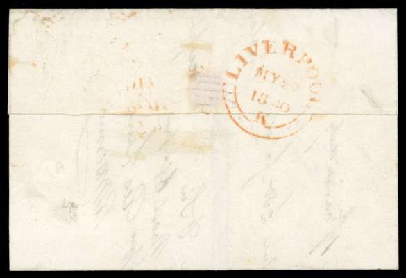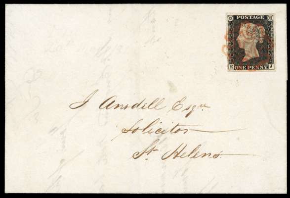 1840 ‘May Date’ entire letter addressed to St. Helens bearing 1d grey black Plate 1a (KJ) with four good margins, well struck by red MC, backstamped by Liverpool d/s in for MY 20 1840 in red, very fine example in lovely quality. SG 3; Spec A1(3)th priced £2500