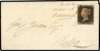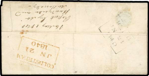 1840 entire addressed to Kelso, franked by 1d black, Plate 1a (GC), four large margins, and tied by red MC, backstamped with Coldstream d/s for JN 21 and Kelso arrival mark for the same day. SG 2, Spec. AS2