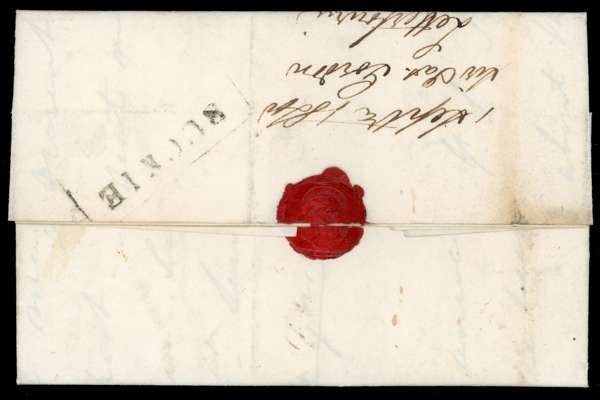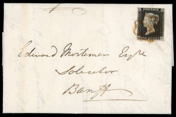 1840 1d black, Plate 2 (RF), four margins, on an entire addressed to Banff from Letterfourie, dated for 1st Sept 1840, tied by a strike of the distinctive olive-brown Buckie Maltese Cross and backstamped by undated Buckie boxed handstamp. A vertical fold clear of the adhesive, otherwise fine. SG 2.