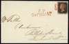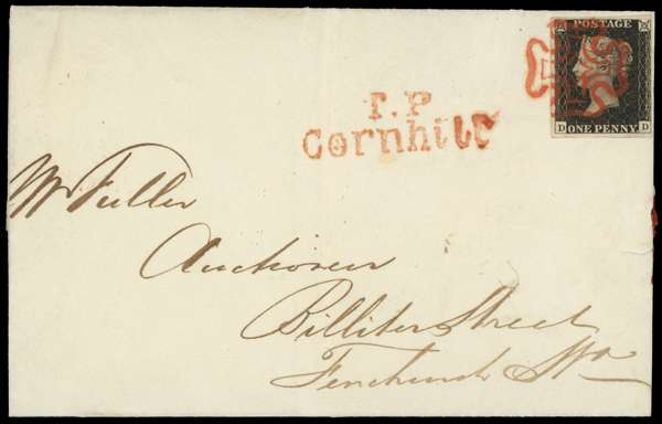 1840 entire letter, locally sent within London, bearing 1d black Plate 3 (DD), four clear to good margins, nearly cancelled by crisp red MC, showing ‘T.P Conrhill’ h/s and backstamp for JU 11, very fine cover. SG 2