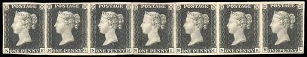 1840 1d black Plate 4 (NF-NL), re-joined horizontal strip of seven, clear to large margins, mint brilliant large part o.g. a visually stunning item of great appearance, a very rare exhibition piece. BPA Cert. (1983) SG 2 cat £56,000++