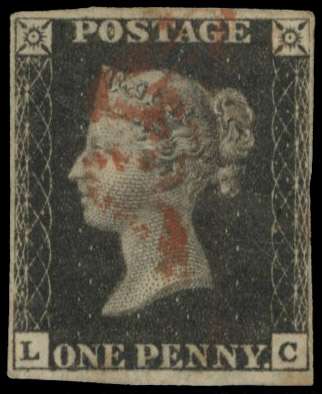 1840 1d black Plate 4 (LC) four margins, close at right, smudged red-brown MC SG 2