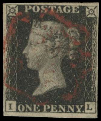 1840 1d black Plate 5 (IL) four margins, light red Maltese Cross SG 2