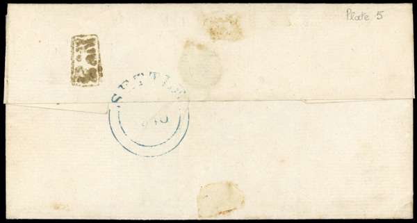 1840 1d black, plate 5 (IC), four even margins, tied to cover addressed to Clitheroe cancelled by red Maltese Cross, the reverse with blue Settle dispatch. Fine. SG 2