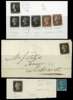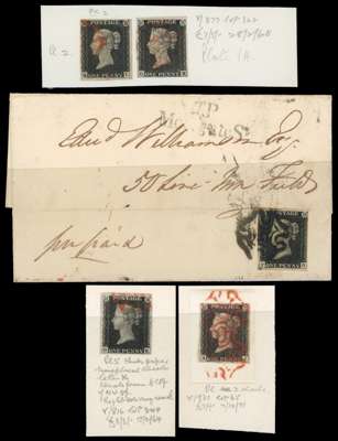1d black group of eleven four-margined used examples, including two on covers. Mostly plated; includes Plate 5 DB (3, states, matched with two in red), also 1840 2d blue with clear to fair margins. Condition a little mixed but a very good group