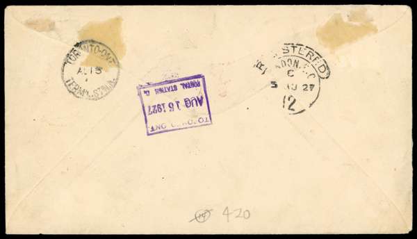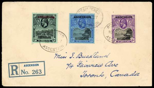Ascension SG 7-9 1927 registered cover to Toronto with 1922 1s, 2s and 3s, registered oval cancels of 18 JY. 2s with a vertical crease, otherwise fine and uncommon. SG 7-9
