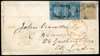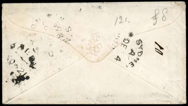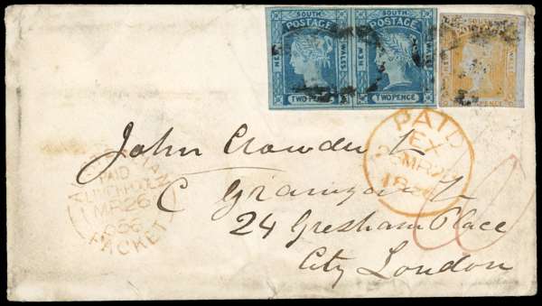 1855 (NO 21) envelope to London franked Laureated 2d horizontal pair, close margin at top, otherwise large with dividing line visible on each side plus 8d with margin touched at base tied unclear obliterators, one 2d by Paid arrival, at left red AUSTRALIAN PACKET/ PAID/ LIVERPOOL transit, reverse with despatch and arrival cancels