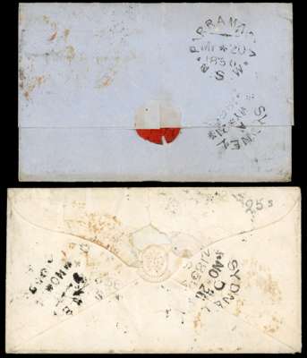 1855 cover to London bearing single franking 6d top marginal, two touched margins cancelled unclear obliterator, bold red ‘5’ handstamp below stamp, at left Australian Paid Liverpool Packet date stamp, arrival at top centre, despatch and Sydney backstamps, damaged bottom left corner, plus 1856 outer letter sheet from same correspondence bearing single franking 6d tied ‘2’ numeral obliterator and red three handstamp below, reverse with Parramara despatch and Sydney transit