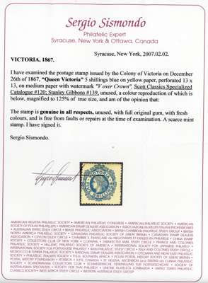 1867-81 5s blue/yellow,, fresh large part o.g. Typical centring but remarkably fine for this key rarity. Sismondo cert (2007) SG 139 cat £4,250