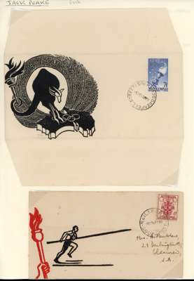 1956 Melbourne Olympics two Jack Peake special covers for the 4d in red and black (torch and pole vault) and the 7 ½d. with Kangaroo over Australia with Olympic Rings, also a 1956 illustrated Olympic cover used stampless in 1961 and bearing postage dues 3d. (2) and 10d.; an interesting group