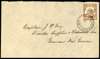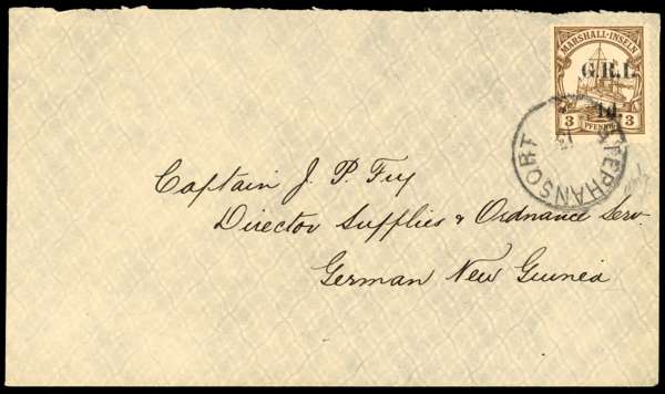 1914 GRI 1d on 3pf brown, tied by STEPHANSORT/13 postmark (in use at Rabaul at this time), locally addressed to Capt. Fry, “Director Supplies & Ordnance Serv., German New Guinea”. Backflap missing, otherwise a fine and neat cover. SG 50