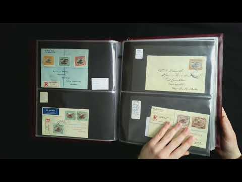 Postal History. Red SG Major cover album with 58 items. We note 1909 cover with 2½d pale ultramarine (SG 56a) with ‘rift in clouds’, backstamped Thursday Island and Brisbane; 1924 Marsh cover with 2s6d and 5s, 1917 1d surcharge set on (very late) 1939 cover, several flown items, Panton cover, 1935 cover with 1s3d Pictorial, 1941 censored to England with 9d Pictorial, 1943 censored to New South Wales with 4d McCracken Pictorial, some good Officials including a 1936 item with 9d SG O63 and 1s3d pair SG O65