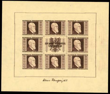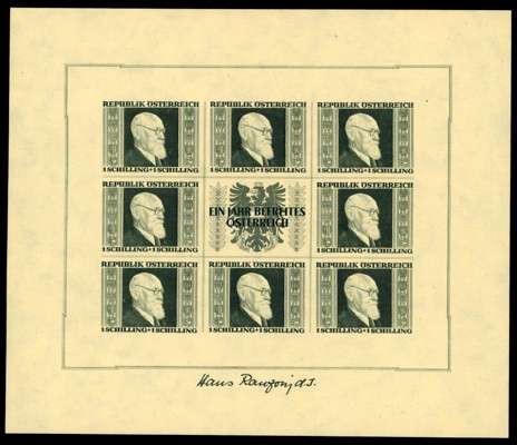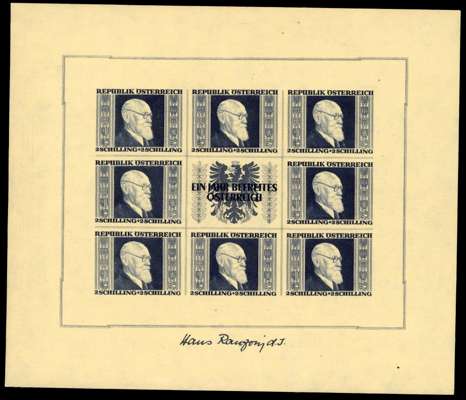 1946 Dr Renner set of four miniature sheets consisting of eight stamps and a central vignette, a couple of tiny iusual black marks in gum signed, fresh unmounted o.g.