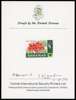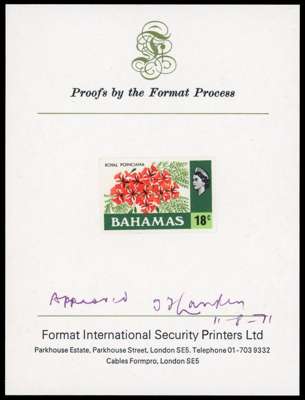 1971 imperforate plate proof of the 18c ‘Royal Poinciana’, affixed to Format International presentation card (96x126mm) with manuscript annotation ‘Approved’, signed and dated ‘11-8-71’'. Accompanied by a photographic proof in monochrome on card (77x63mm) similarly annotated. Fine and scarce pair. SG 371var