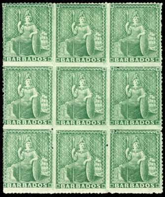 Barbados 1861-70 (½d) blue-green, block of nine, mint, SG 21a