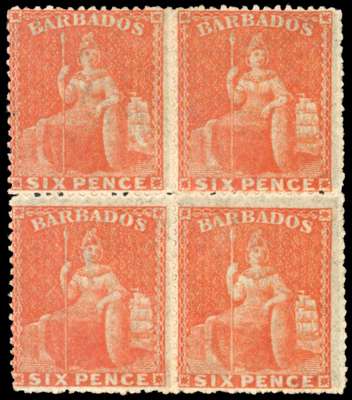 Barbados 1861-70 6d dull orange-vermilion, block of four, mint, SG 32
