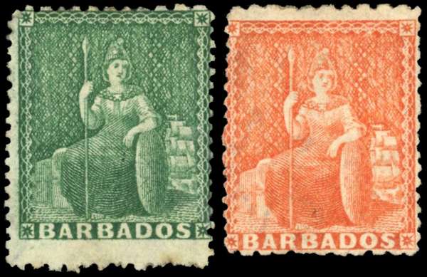 Barbados 1872 (½d) green and (4d) dull vermilion, SG 56/57