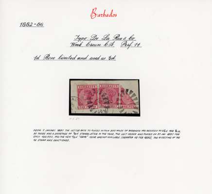 1882-86 1d rose bisected (½d) used on piece, with a further two 1d rose, making up the 2½d letter rate (to places within 300 miles of Barbados), cancelled by duplexes for JA 11 87, small stains at far left, otherwise fine, very scarce. SG 91/91a cat £2250 on cover.