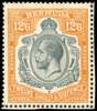 Postal Fiscal. 1937 12s6d grey & orange ‘REVENUE-REVENUE’, showing variety ‘Gash in fruit & leaf’ (R5/12) mint part o.g. typical brownish crackly gum, still a lovely example of this rare stamp. SG F1g cat £4500