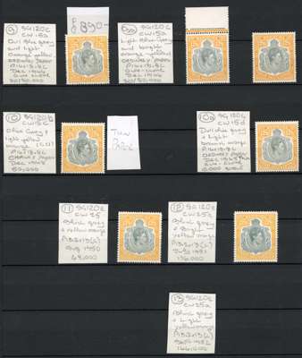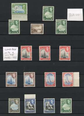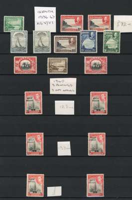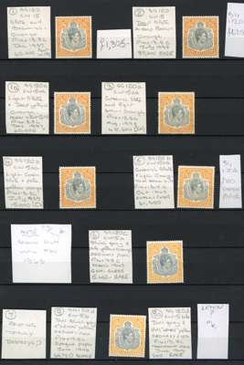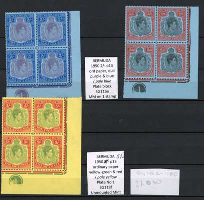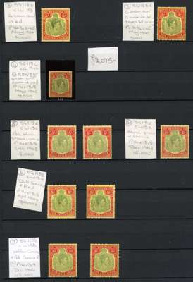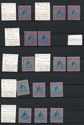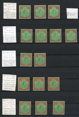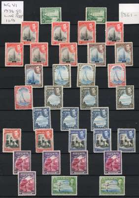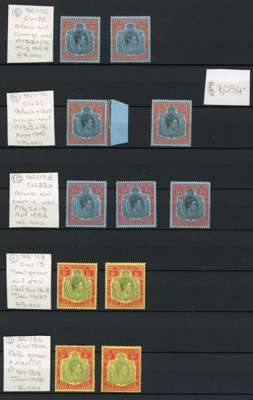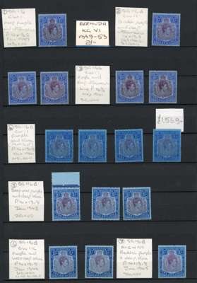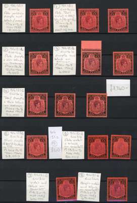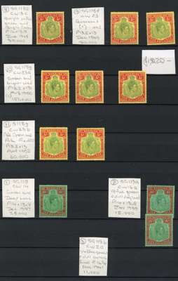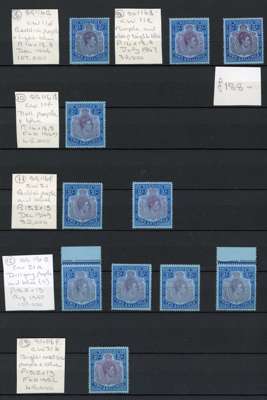 1938-52 mint collection on stocksheets with range of low values including comb perfs; 2s (27) with SG 116a x 3 and 116b x 2; 2s6ds (21) with SG 117a x 2, one particularly fine; 5s (21) with SG 118a x 2 and 118b, also 118bd broken upper right scroll; 10s (18); 12s6ds (15) with a candidate for SG 120 but this is partially stuck down to stocksheet, may be removable with care; £1 (14) including SG 121 x 3. Also perf 13 Plate blocks of 2s, 2s6d, 5s. A good group with very high catalogue value