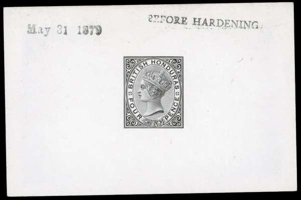 1872-79 4d die proof in black on glazed card (92x60mm) dated at upper left ‘May 31 1879’ and endorsed ‘BEFORE HARDENING’. A scarce and desirable proof. For SG 14.