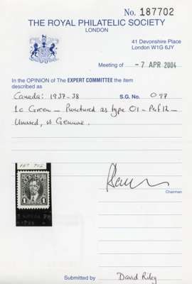 Officials. 1937-38 1c green, perf type O1 ‘OHMS’, mint large part o.g., minor perf toning but a rarity in mint condition. RPS Certificate (2004). SG O97, unpriced in Part 1