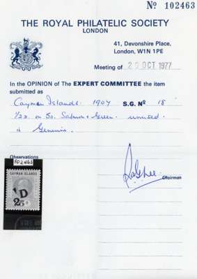 1907 ½d on 5s salmon and green large part o.g. RPS Certificate (1977). SG 18, £325