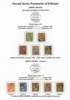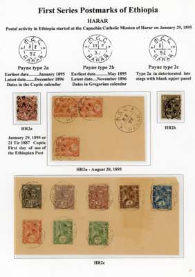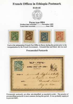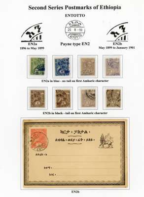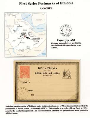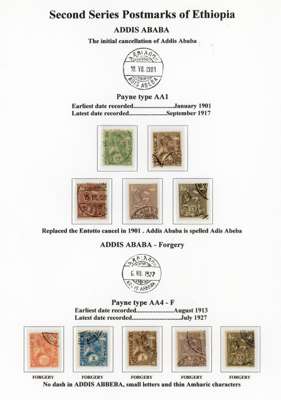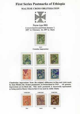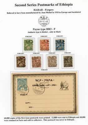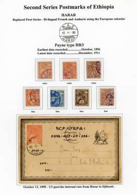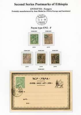 1890-1900s postmark study with bilingual Ankober cds, the canceller ordered before the move of the capital to Addis Ababa and where all items were cto, here with ½g stationery card, Harar with Coptic first day of used piece, later cancel with blank upper right segment piece with 8 stamps, Ent0tto cancel in three different types, Maltese Crosses with rare genuine black example, Jean Michel clandestine impressions in blue or violet and some forgeries, Harar including 1898 ½g internal stationery card, forgeries set and a 1g stationery card