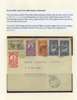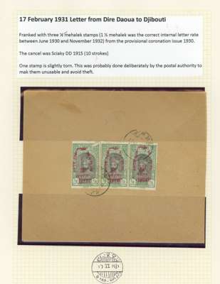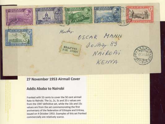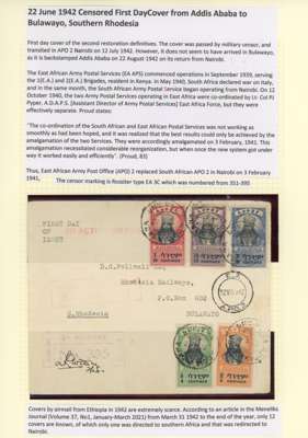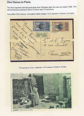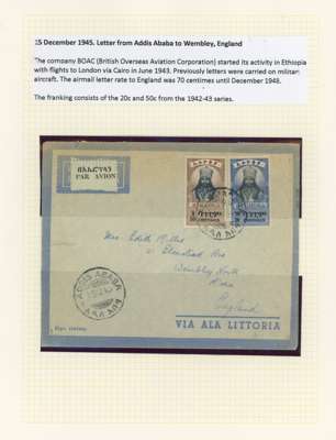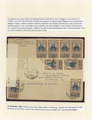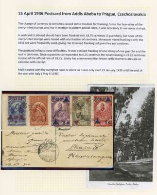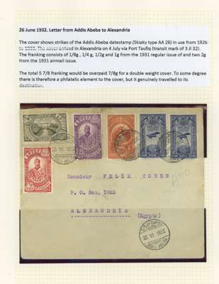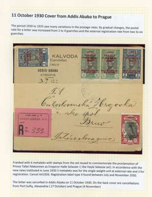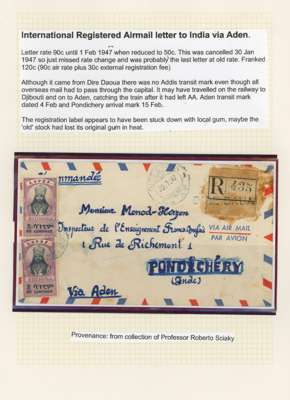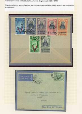 Postal History. Small group on pages with 1930 registered cover to Bruno, Czechoslovakia franked Hayle Selassie overprints at correct rate, 1936 postcard to Prague used with centime surcharges and a 1g mixed currency franking, 1942 first day of issue cover to Rhodesia, 1943 censored airmail cover to USA bearing eight 50c, 1946 airmail postcard to France, 1947 registered airmail cover to Pondichery via Aden with two 60c (11 items)