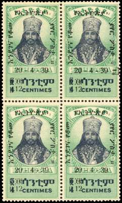 Ethiopia 1947 Resumption of Airmail showing (pos 8) extra box and dash to right of date, the box coming from the heavy impression of the frame which holds the surcharge, block of four with lightly overall toned unmounted o.g.