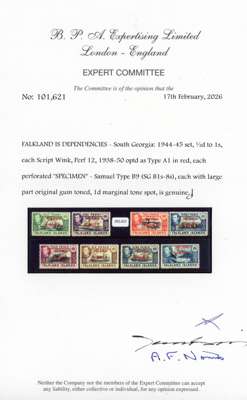 South Georgia. 1944-45 set of 8 to 1s, perf ‘SPECIMEN’ (type B9), unmounted o.g., lightly toned but very scarce unmounted. BPA Certificate (2026). SG B1s/B8s, cat £650