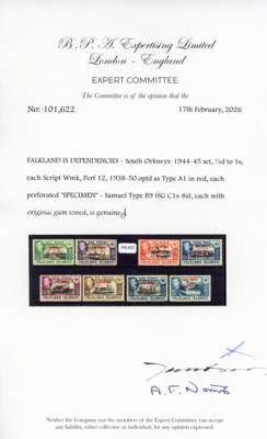 South Orkneys. 1944-45 set of 8 to 1s, perf ‘SPECIMEN’ (type B9), unmounted o.g., lightly toned but very scarce unmounted. BPA Certificate (2026). SG C1s/C8s, cat £650