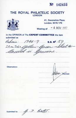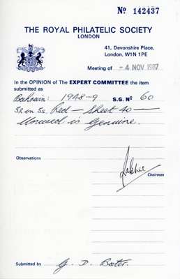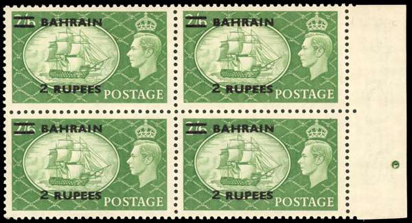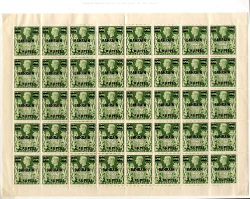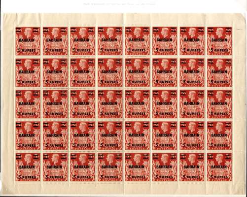 1948 2r on 2/6d and 5r on 5/- complete sheets of forty, unmounted o.g. The 2r sheet devoid of varieties; the 5r sheet with ‘T’ guidemarks in the hair on R2/3 and 2/7 and the ‘wounded lion’ on R4/2; R5/4 with ‘T’ guides in the hair, across the hairline and in the garter belt at base. Each with RPS Certificates (1987), both ex Gerry Bater; unusual multiples. SG 59-60, £440 as basic stamps