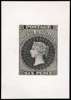 1855 6d, stamp-size die proof in black by Perkins Bacon, affixed to card (35x50mm), tiny corner defect at lower right but a beautiful proof of great rarity. Believed to be one of only two such proofs in private hands (plus one other in the Royal Collection). A wonderful and highly important showpiece, missing from virtually every award-winning collection assembled over the last 75 years. BPA and RPS certs (2025).