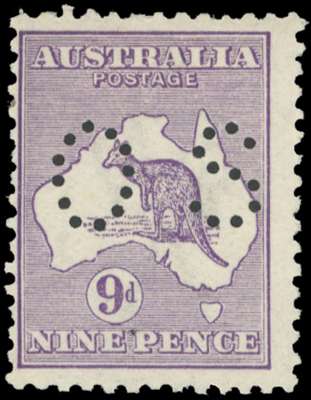 Official. 1914 9d violet, wmk 2, type O2 ‘OS’ puncture, mint large part o.g. with typical perfs and centring, scarce. Ceremuga cert (2025). SG O24, cat £325