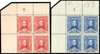 Official. 1930 'Sturt' 1½d scarlet and 3d blue, perf 'OS' (type O2), matching upper left corner blocks of 4 respectively with plate numbers '6' and '1', fresh mint unmounted o.g. (mounted in top margin only), minor wrinkling from the perfin process still a fine and rare pair of plate blocks from the special album presented to the Duke of Gloucester in 1934. SG O121/22 (BW 139ba/140ba, cat A$1050+)