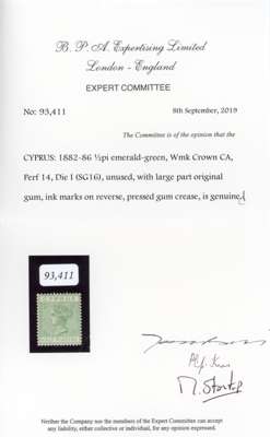 1882 ½pi emerald-green, watermark Crown CA. A fresh-looking mint example, large part o.g. with inkmark on reverse and a pressed crease; rare and attractive. BPA Certificate (2019). SG 16, £5000