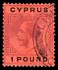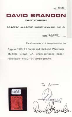 1923 £1 purple and black on red paper, Type 12, fine used with part Limassol CDS. Scarce. Brandon Certificate (2022). SG 101, £3500