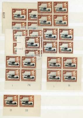 1938-50 1/- multiples, mint. SG 145 two unmounted blocks, one top left corner with sheet number, the other part imprint with lathework, the latter with brown gum; SG 145a three unmounted marginal blocks, one with two stamps foxed; SG 145b Plate 1-7A and 1-8A blocks, respectively with one and two stamps hinged; and SG 145ba, Plate 3B-11B pair, hinged on the selvedge. £884