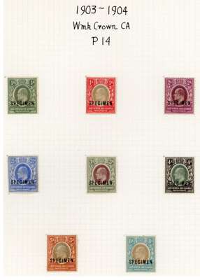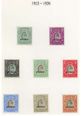 1903-08 KEVII collection otpd SPECIMENs on album leaves, including: 1903-04 set to 50r grey and red-brown, 1907-08 New Currency set to 75c grey & pale blue, large part o.g. some imperfections, otherwise mostly of fine appearance. SG 1-14s & 34-42s £1425